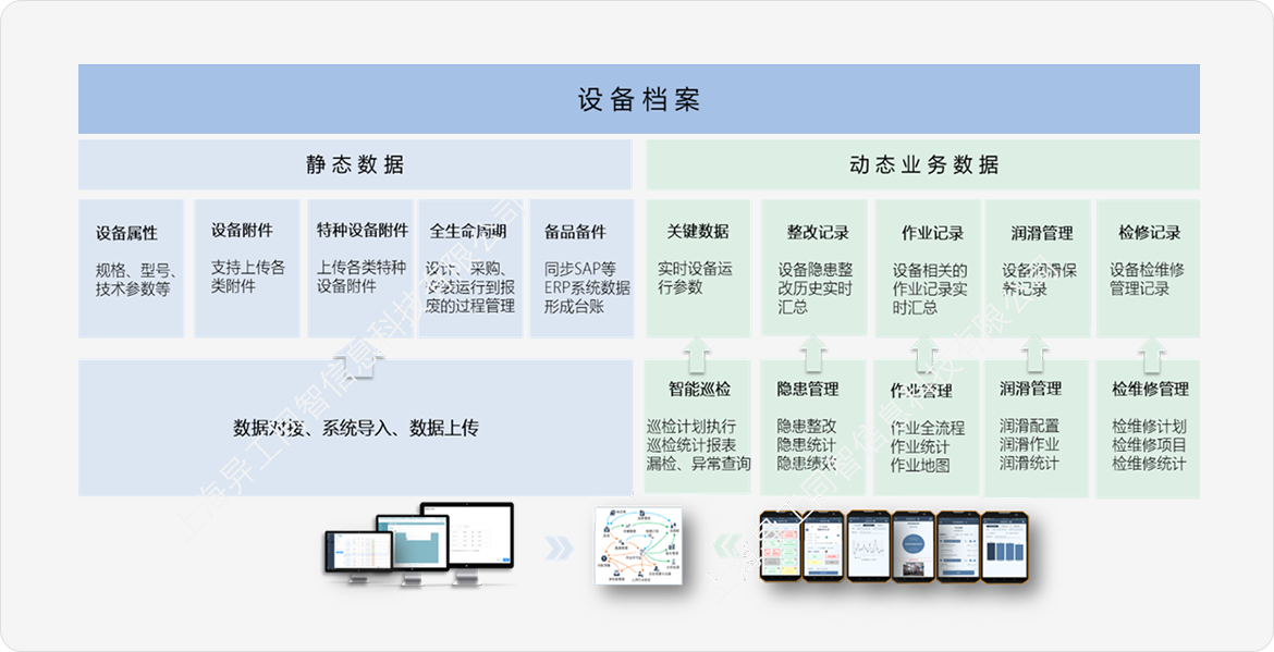 工智道機電管理系統利用便攜移動終端以及基于云儲存的知識庫系統,幫助企業現場操作人員進行現場設備管理工作,隨時采集運行數據、上傳設備隱患,查看設備參數,記錄檢維修過程,自動匯總統計績效,形成標準的評價體系。各相關聯的現場業務模塊數據自動歸檔以便管理人員隨時查看,提高設備的利用率和可靠性。