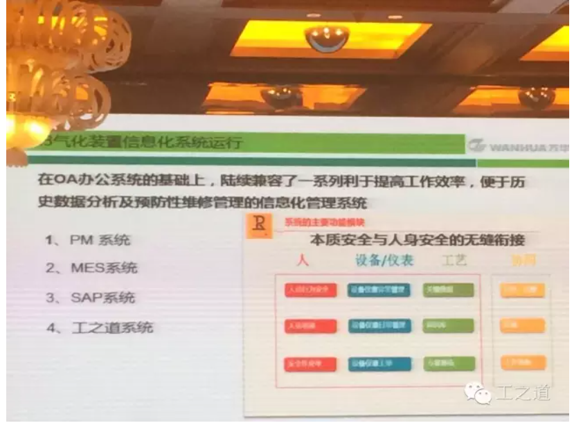 現有客戶萬華集團介紹了工之道系統與其他管理系統PM/MES/SAP協同使用情況,并介紹了工之道系統的優點。