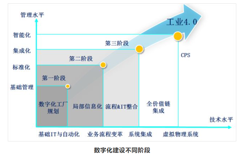 · 兩化融合,數字化向智能化轉變:將標準、規范等通過系統固化和落實,融入企業生產管理體系,各方面的信息逐步模型化,最終實現智能化工廠。